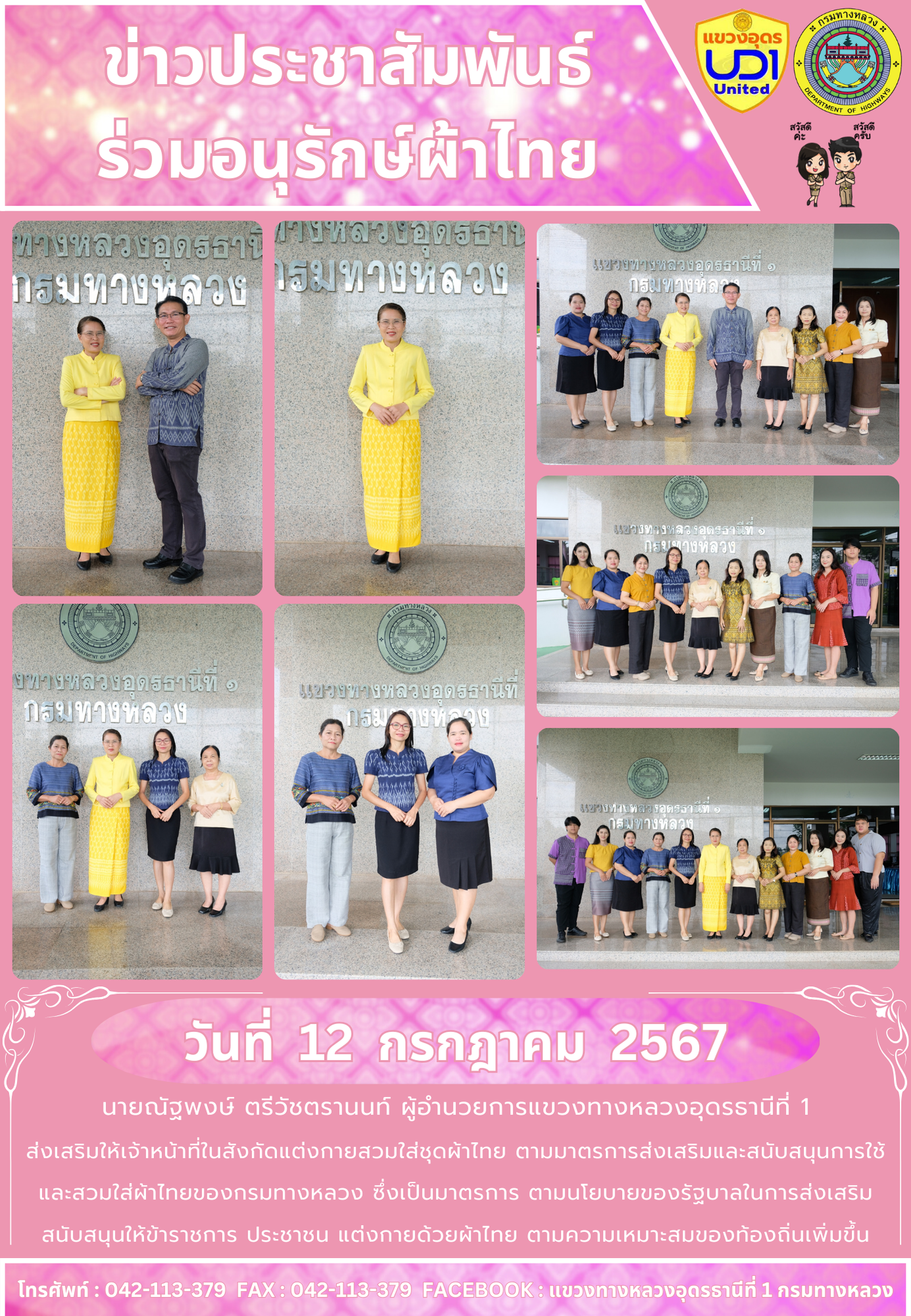 นายณัฐพงษ์ ตรีวัชตรานนท์ ผู้อำนวยการแขวงทางหลวงอุดรธานีที่ 1 พร้อมด้วย นายศุภชัย ศรีโยธี รองผู้อำนวยการ (ฝ่ายวิศวกรรม) นางพานิช สาระมาศ รองผู้อำนวยการ (ฝ่ายบริหารงานทั่วไป) นายจักรกริช แก้วแสงอ่อน รองผู้อำนวยการ (ฝ่ายปฏิบัติการ) และเจ้าหน้าที่ในสังกัดร่วมแต่งกายสวมใส่ชุดผ้าไทยตามมาตรการส่งเสริม และสนับสนุนการใช้และสวมใส่ผ้าไทยของกรมทางหลวง ซึ่งเป็นมาตรการตามนโยบายของรัฐบาลในการส่งเสริมและสนับสนุนให้ข้าราชการ ประชาชน แต่งกายด้วยผ้าไทย ตามความเหมาะสมของท้องถิ่นเพิ่มขึ้น