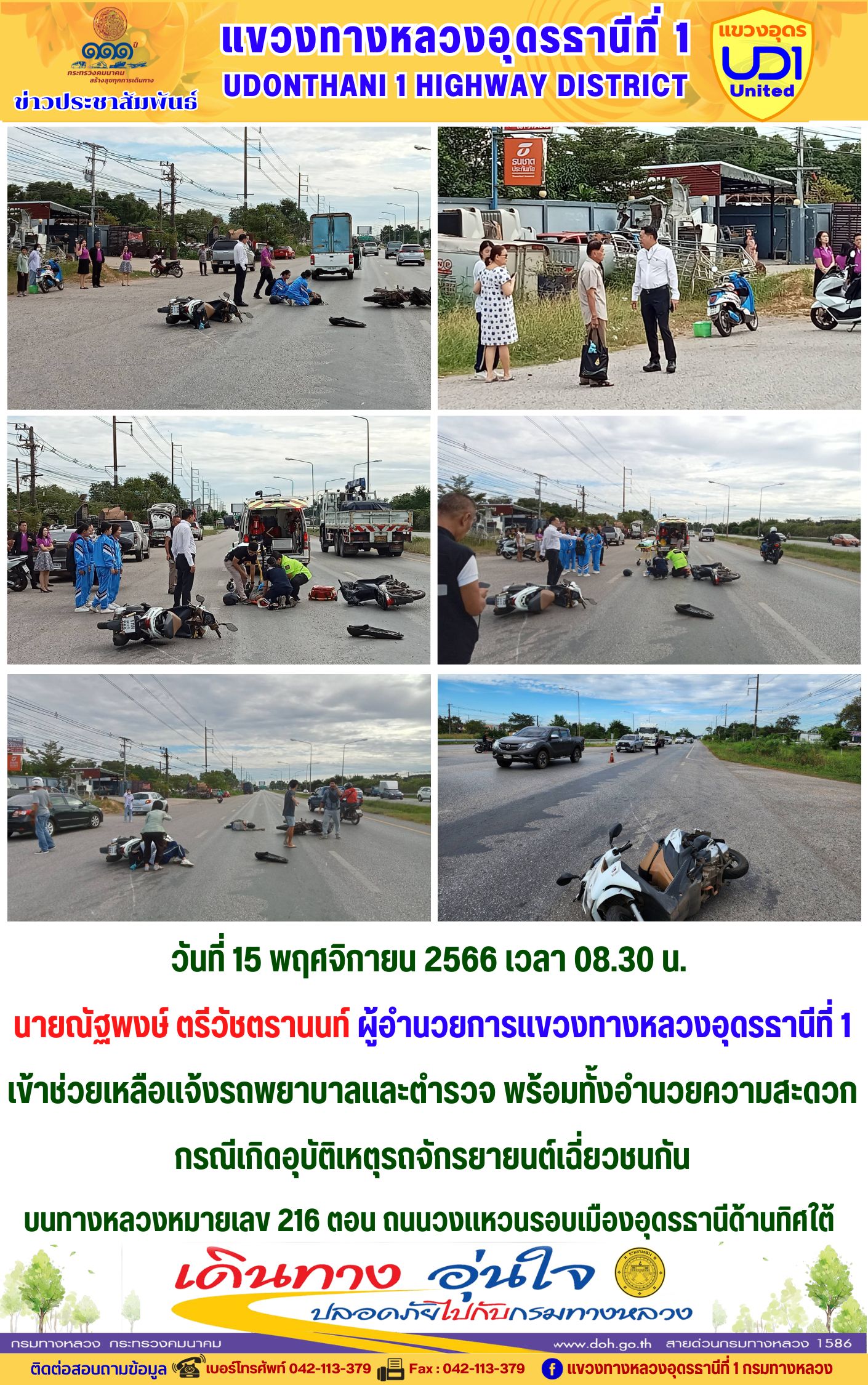 นายณัฐพงษ์ ตรีวัชตรานนท์ ผู้อำนวยการแขวงทางหลวงอุดรธานีที่ 1 เข้าช่วยเหลือแจ้งรถพยาบาลและตำรวจ พร้อมทั้งอำนวยความสะดวก กรณีเกิดอุบัติเหตุรถจักรยายนต์เฉี่ยวชนกัน บนทางหลวงหมายเลข 216 ตอน ถนนวงแหวนรอบเมืองอุดรธานีด้านทิศใต้