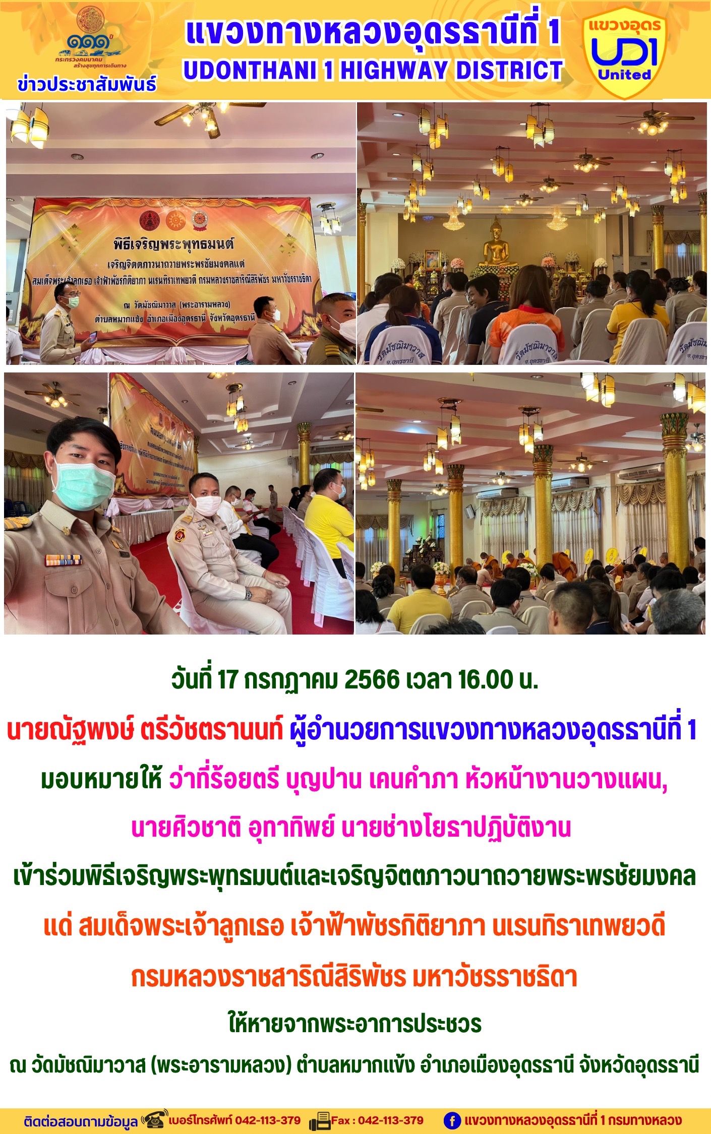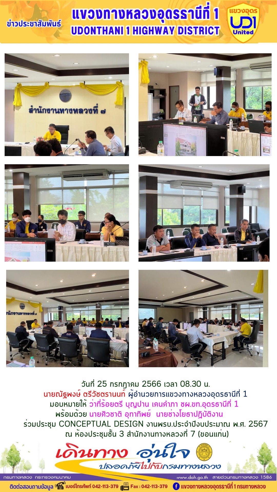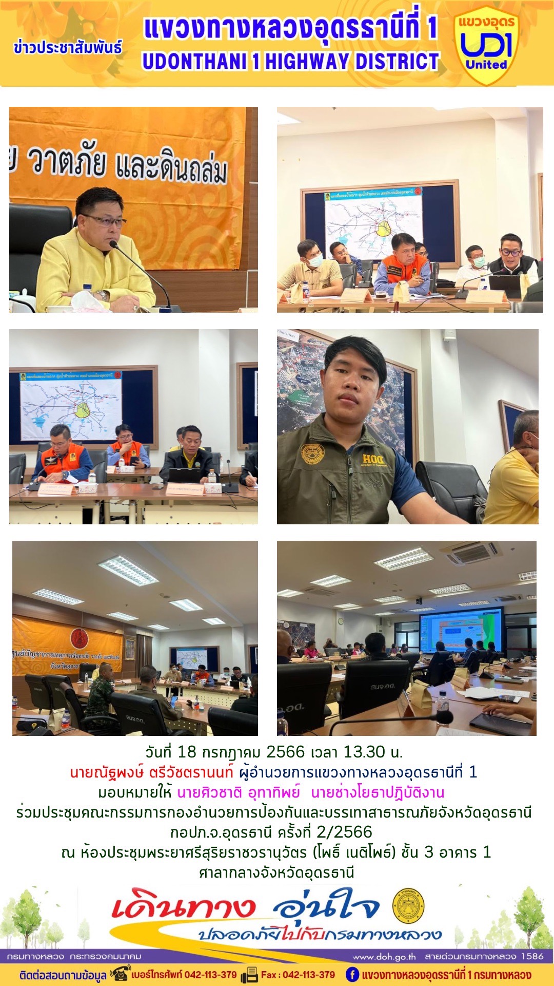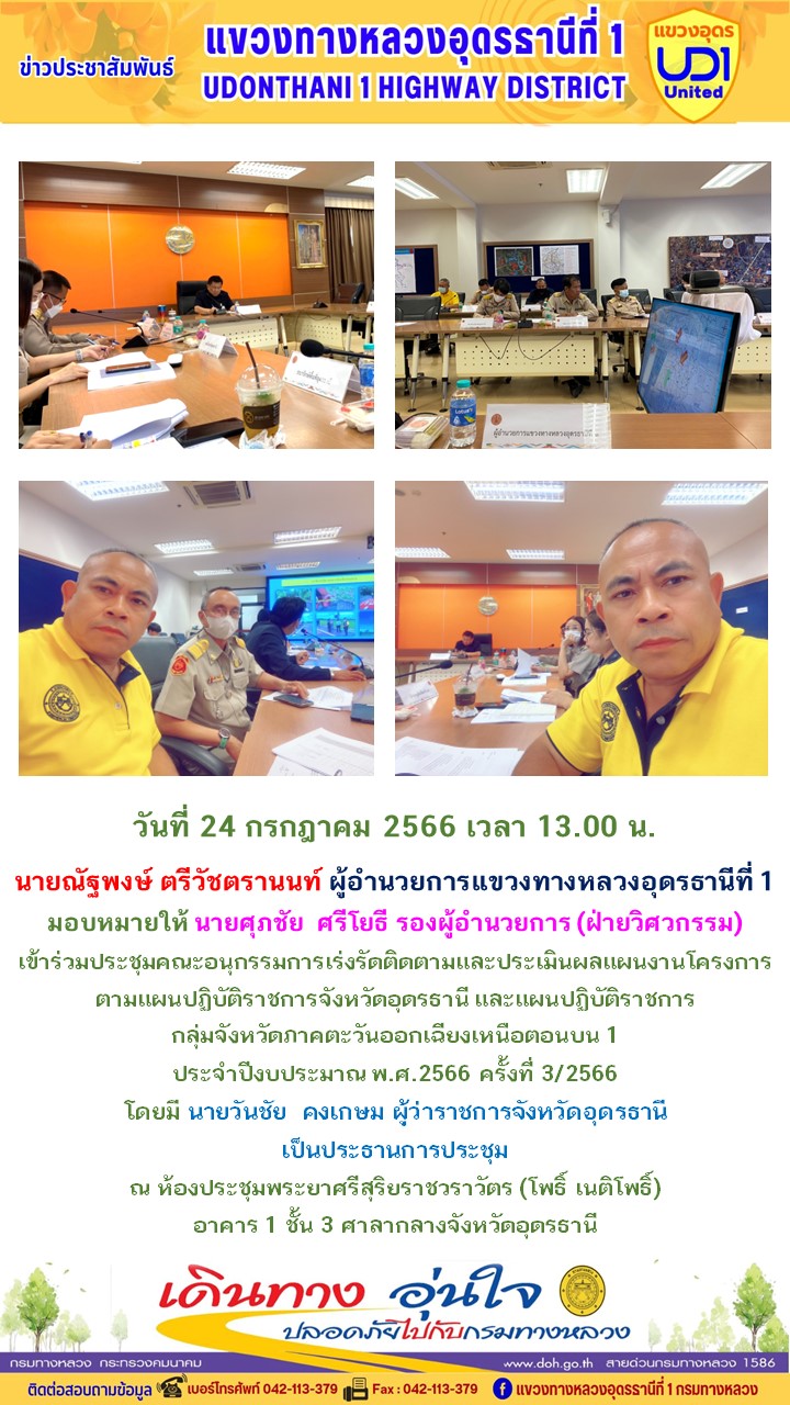 นายณัฐพงษ์ ตรีวัชตรานนท์ ผู้อำนวยการแขวงทางหลวงอุดรธานีที่ 1 มอบหมายให้ นายศุภชัย ศรีโยธี รอ.ขท.อุดรธานีที่ 1 (ว) เข้าร่วมประชุมคณะอนุกรรมการเร่งรัดติดตามและประเมินผลแผนงานโครงการตามแผนปฏิบัติราชการจังหวัดอุดรธานี และแผนปฏิบัติราชการกลุ่มจังหวัดภาคตะวันออกเฉียงเหนือตอนบน 1 ประจำปีงบประมาณ พ.ศ.2566 ครั้งที่ 3/2566