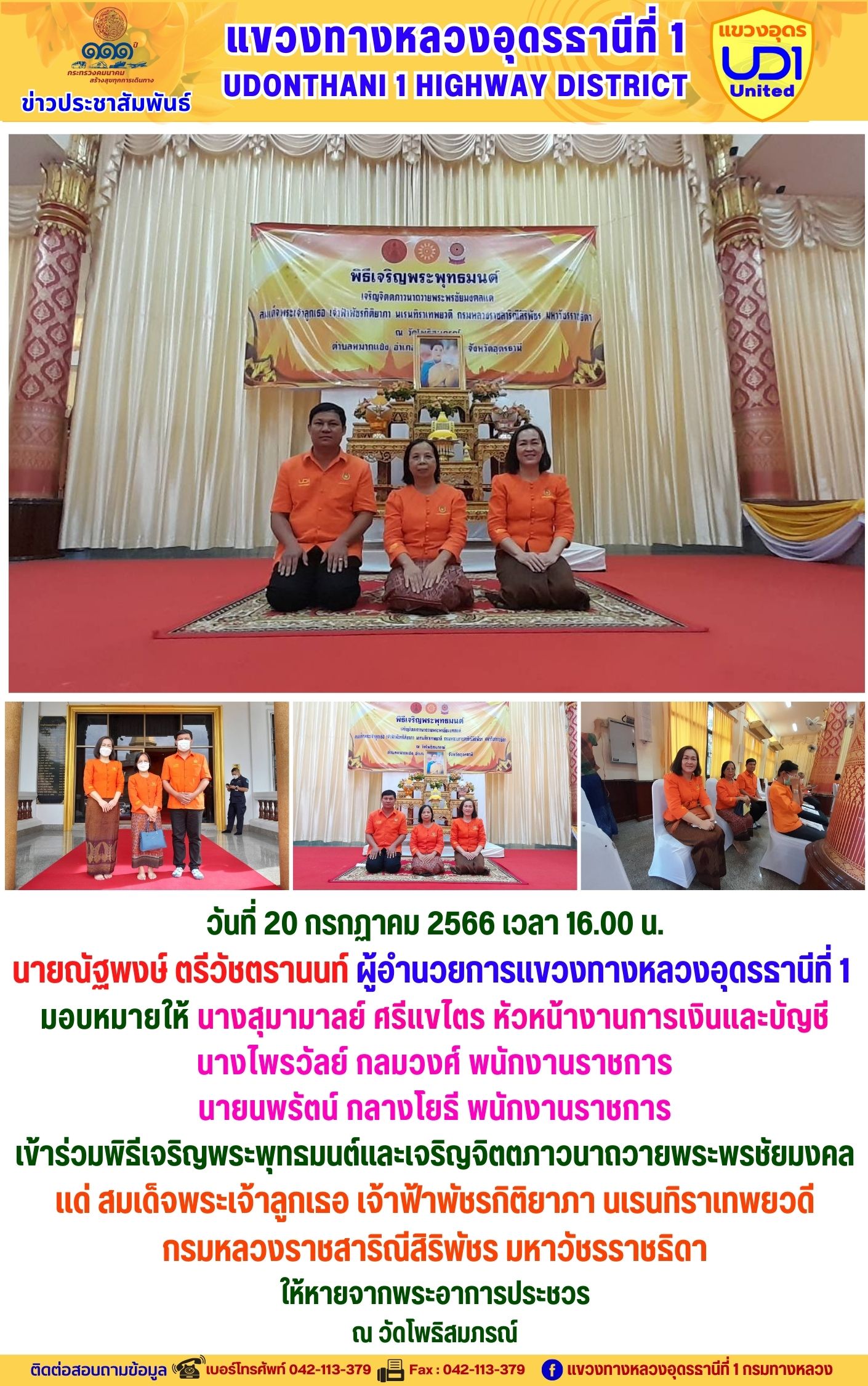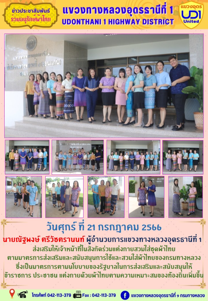 นายณัฐพงษ์ ตรีวัชตรานนท์ ผู้อำนวยการแขวงทางหลวงอุดรธานีที่ 1 พร้อมด้วย นายสมเด็จ ปุระเทพ รอ.ขท.อุดรธานีที่ 1 (ป) ,นายศุภชัย ศรีโยธี รอ.ขท.อุดรธานีที่ 1 (ว), นางพานิช สาระมาศ รอ.ขท.อุดรธานีที่ 1 (บ) และเจ้าหน้าที่ในสังกัดร่วมแต่งกายสวมใส่ชุดผ้าไทยตามมาตรการส่งเสริมและสนับสนุนการใช้และสวมใส่ผ้าไทยของกรมทางหลวง ซึ่งเป็นมาตรการตามนโยบายของรัฐบาลในการส่งเสริมและสนับสนุนให้ข้าราชการ ประชาชน แต่งกายด้วยผ้าไทย ตามความเหมาะสมของท้องถิ่นเพิ่มขึ้น