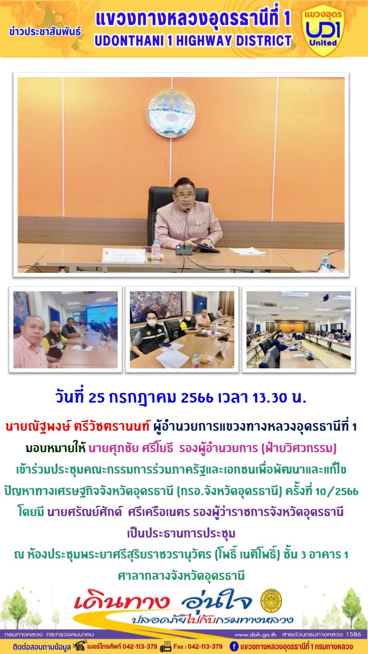 นายณัฐพงษ์ ตรีวัชตรานนท์ ผู้อำนวยการแขวงทางหลวงอุดรธานีที่ 1 มอบหมายให้ นายศุภชัย ศรีโยธี รองผู้อำนวยการ (ฝ่ายวิศวกรรม) เข้าร่วมประชุมคณะกรรมการร่วมภาครัฐและเอกชนเพื่อพัฒนาและแก้ไขปัญหาทางเศรษฐกิจจังหวัดอุดรธานี (กรอ.จังหวัดอุดรธานี) ครั้งที่ 10/2566 โดยมี นายศรัณย์ศักด์ ศรีเครือเนตร รองผู้ว่าราชการจังหวัดอุดรธานี เป็นประธานการประชุม ณ ห้องประชุมพระยาศรีสุริยราชวรานุวัตร (โพธิ์ เนติโพธิ์) ชั้น 3 อาคาร 1 ศาลากลางจังหวัดอุดรธานี