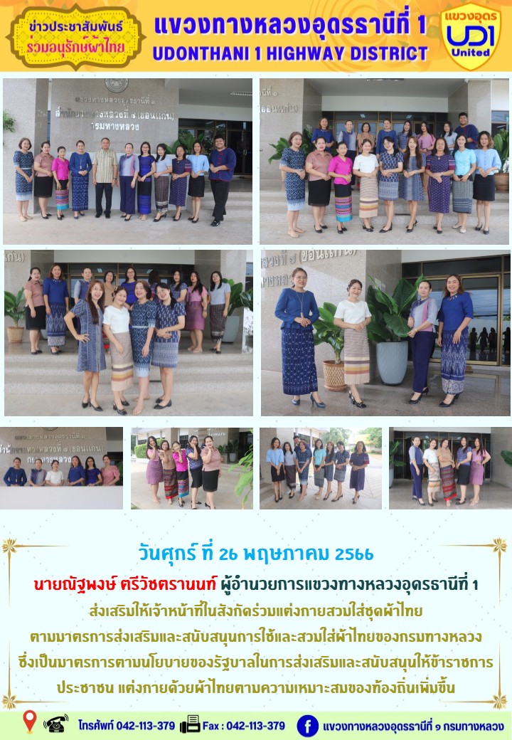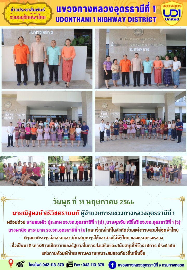 นายณัฐพงษ์ ตรีวัชตรานนท์ ผู้อำนวยการแขวงทางหลวงอุดรธานีที่ 1 พร้อมด้วย นายสมเด็จ ปุระเทพ รอ.ขท.อุดรธานีที่ 1 (ป) ,นายศุภชัย ศรีโยธี รอ.ขท.อุดรธานีที่ 1 (ว) นางพานิช สาระมาศ รอ.ขท.อุดรธานีที่ 1 (บ) และเจ้าหน้าที่ในสังกัดร่วมแต่งกายสวมใส่ชุดผ้าไทย ตามมาตรการส่งเสริมและสนับสนุนการใช้และสวมใส่ผ้าไทย ของกรมทางหลวง ซึ่งเป็นมาตรการตามนโยบายของรัฐบาลในการส่งเสริมและสนับสนุนให้ข้าราชการ ประชาชน แต่งกายด้วยผ้าไทย ตามความเหมาะสมของท้องถิ่นเพิ่มขึ้น
