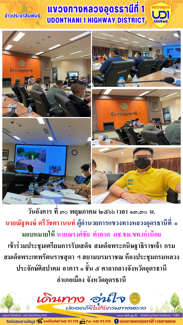 นายณัฐพงษ์ ตรีวัชตรานนท์ ผู้อำนวยการแขวงทางหลวงอุดรธานีที่ 1 มอบหมายให้ นายสมเด็จ ปุระเทพ รอ.ขท.อุดรธานีที่ 1 (ป) ร่วมประชุมกรมการจังหวัดและหัวหน้าส่วนราชการประจำจังหวัดอุดรธานี ประจำเดือนพฤษภาคม 2566 ณ ห้องประชุมกรมหลวงประจักษ์ศิลปาคม อาคาร 1 ชั้น 5 ศาลากลางจังหวัดอุดรธานี