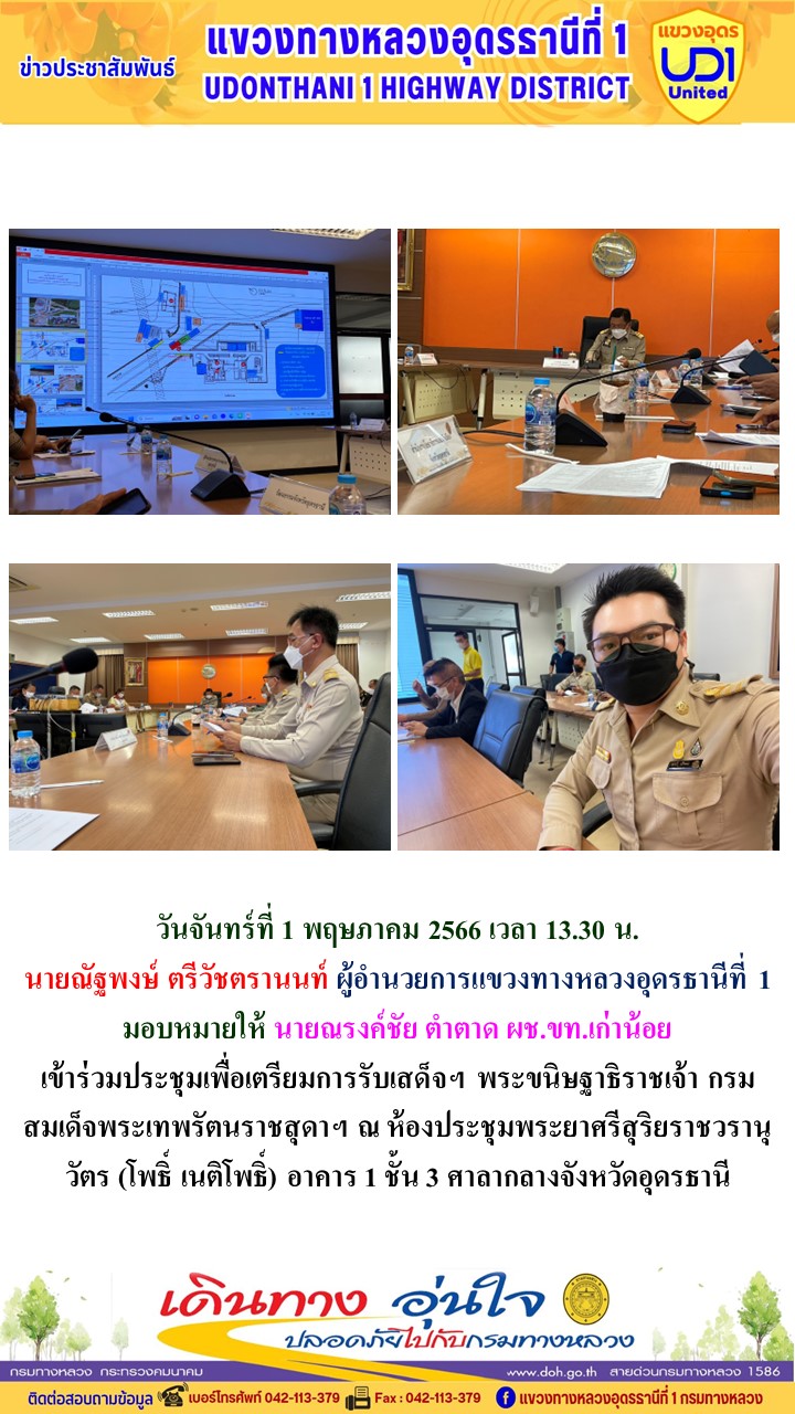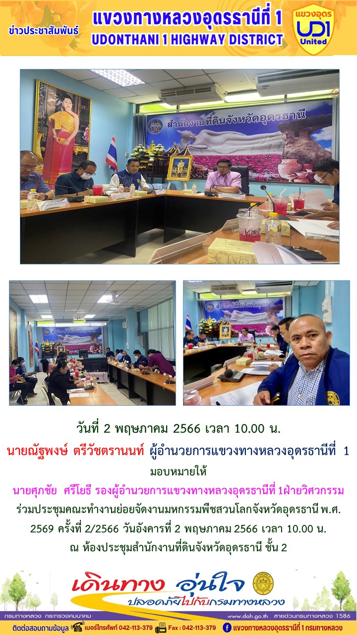 นายณัฐพงษ์ ตรีวัชตรานนท์ ผู้อำนวยการแขวงทางหลวงอุดรธานีที่ 1 มอบหมายให้ นายศุภชัย ศรีโยธี รอ.ขท.อุดรธานีที่ 1 (ว) ร่วมประชุมคณะทำงานย่อยจัดงานมหกรรมพืชสวนโลกจังหวัดอุดรธานี พ.ศ.2569 ครั้งที่ 2/2566 ณ ห้องประชุมพระยาศรีสุริยราชวรานุวัตร (โพธิ์ เนติโพธิ์) ชั้น 3 อาคาร 1 ศาลากลางจังหวัดอุดรธานี
