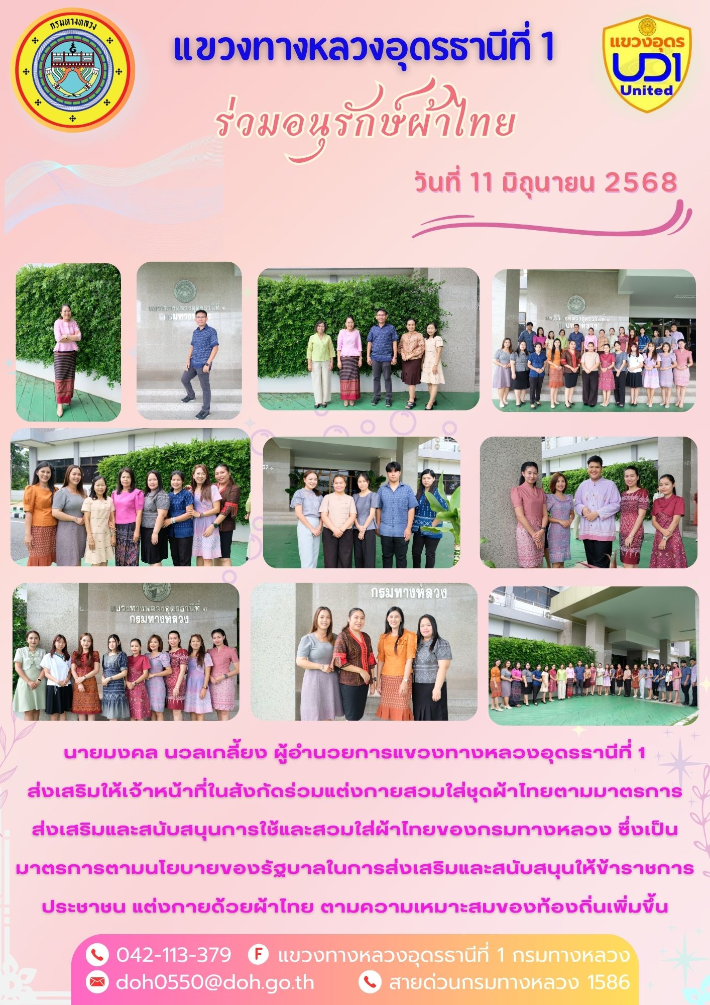นายมงคล นวลเกลี้ยง ผู้อำนวยการแขวงทางหลวงอุดรธานีที่ 1 ส่งเสริมให้เจ้าหน้าที่ในสังกัดร่วมแต่งกายสวมใส่ชุดผ้าไทยตามมาตรการ ส่งเสริมและสนับสนุนการใช้และสวมใส่ผ้าไทยของกรมทางหลวง ซึ่งเป็นมาตรการตามนโยบายของรัฐบาลในการส่งเสริมและสนับสนุนให้ข้าราชการ ประชาชน แต่งกายด้วยผ้าไทย ตามความเหมาะสมของท้องถิ่นเพิ่มขึ้น