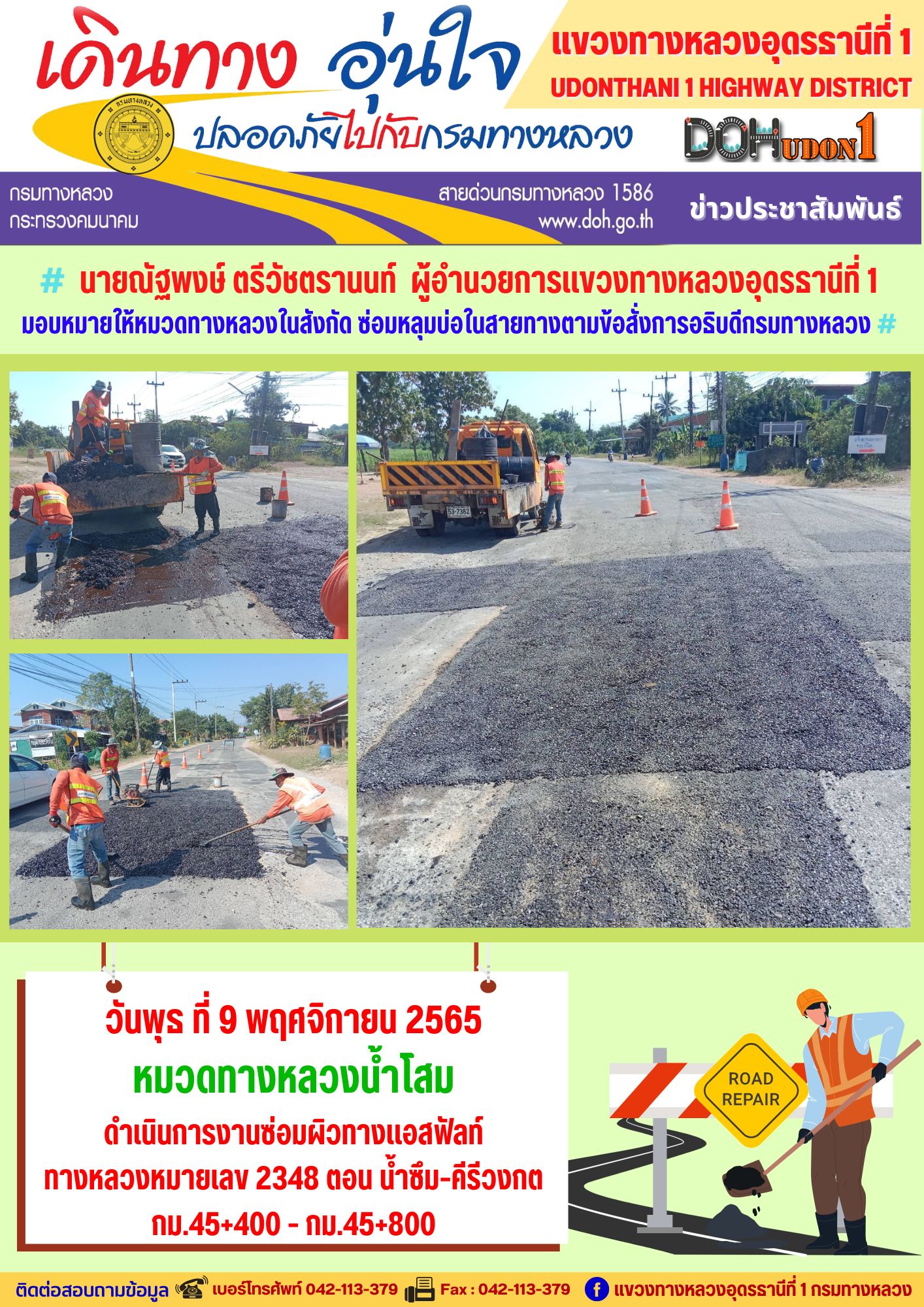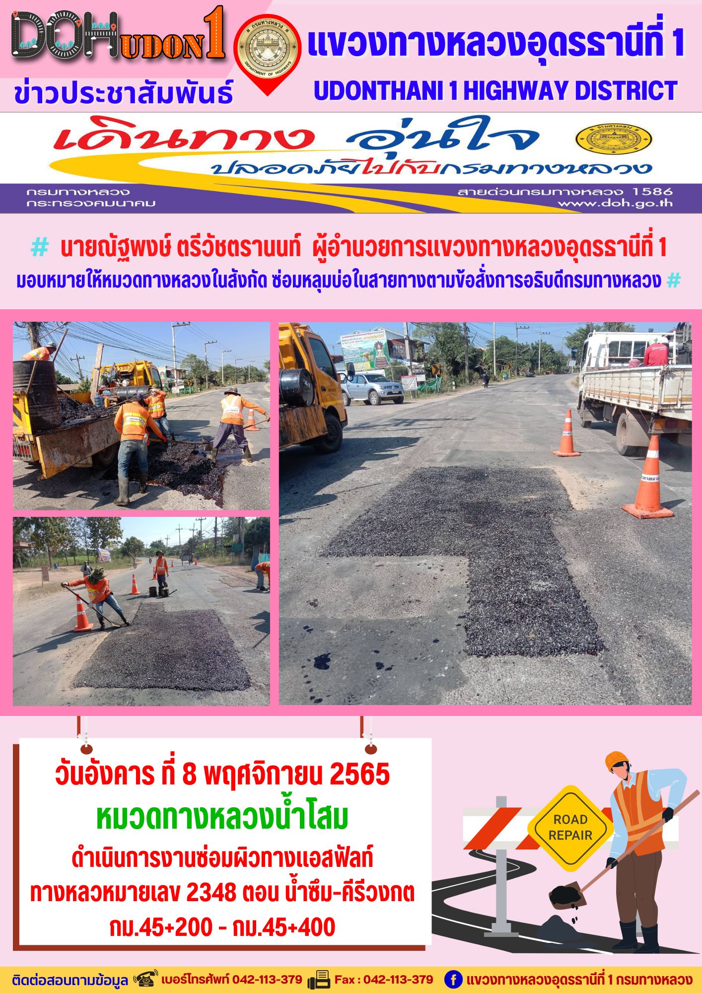 นายณัฐพงษ์ ตรีวัชตรานนท์ ผู้อำนวยการแขวงทางหลวงอุดรธานีที่ 1 มอบหมายให้หมวดทางหลวงในสังกัด ซ่อมหลุมบ่อในสายทางตามข้อสั่งการอธิบดีกรมทางหลวง