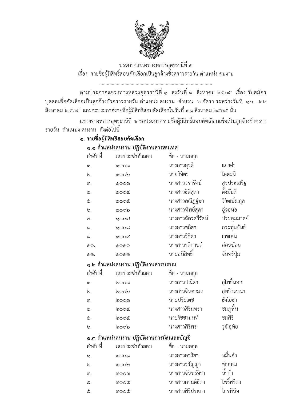 689 01/09/2565 ประกาศแขวงทางหลวงอุดรธานีที่ ๑ เรื่อง รายชื่อผู้มีสิทธิ์สอบคัดเลือกเป็นลูกจ้างชั่วคราวรายวัน ตำแหน่ง คนงาน