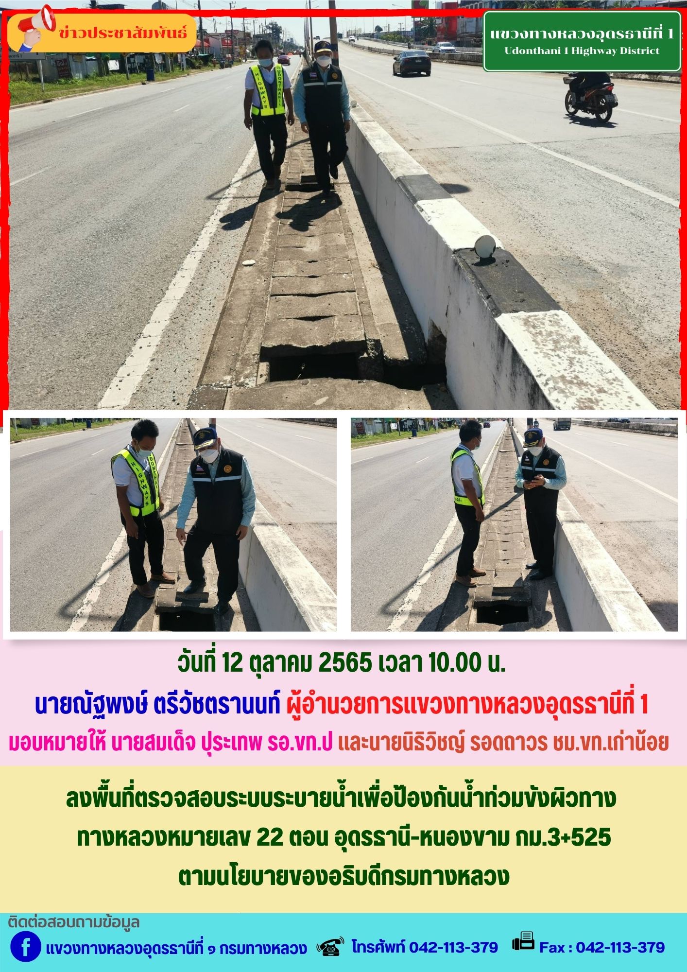 681 12/10/2565 ลงพื้นที่ตรวจสอบระบบระบายน้ำเพื่อป้องกันน้ำท่วมขังผิวทาง ทางหลวงหมายเลข 22 ตอน อุดรธานี-หนองขาม กม.3+525 ตามนโยบายของอธิบดีกรมทางหลวง
