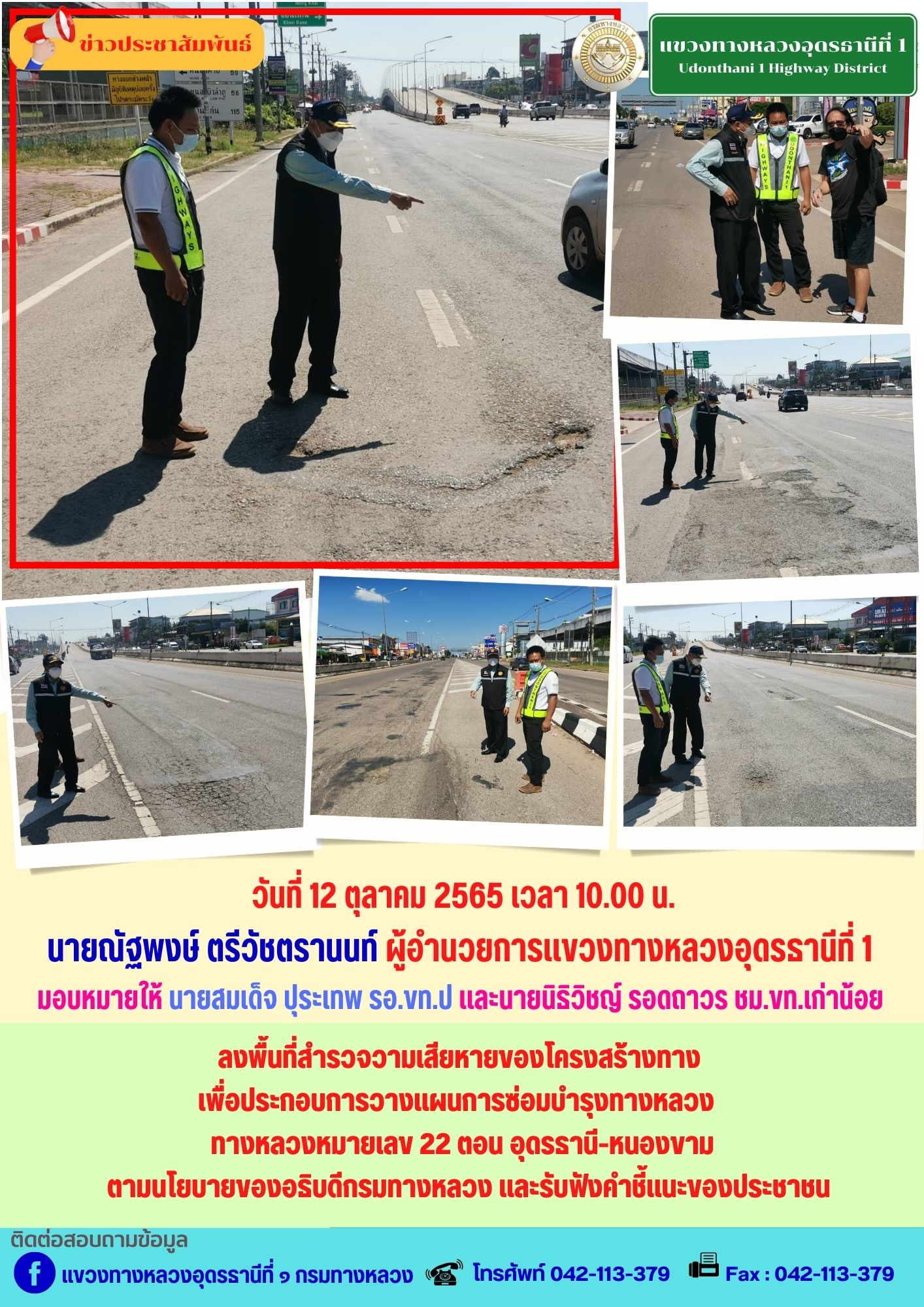 680 12/10/2565 ลงพื้นที่สำรวจวามเสียหายของโครงสร้างทาง เพื่อประกอบการวางแผนการซ่อมบำรุงทางหลวง ทางหลวงหมายเลข 22 ตอน อุดรธานี-หนองขาม ตามนโยบายของอธิบดีกรมทางหลวง และรับฟังคำชี้แนะของประชาชน