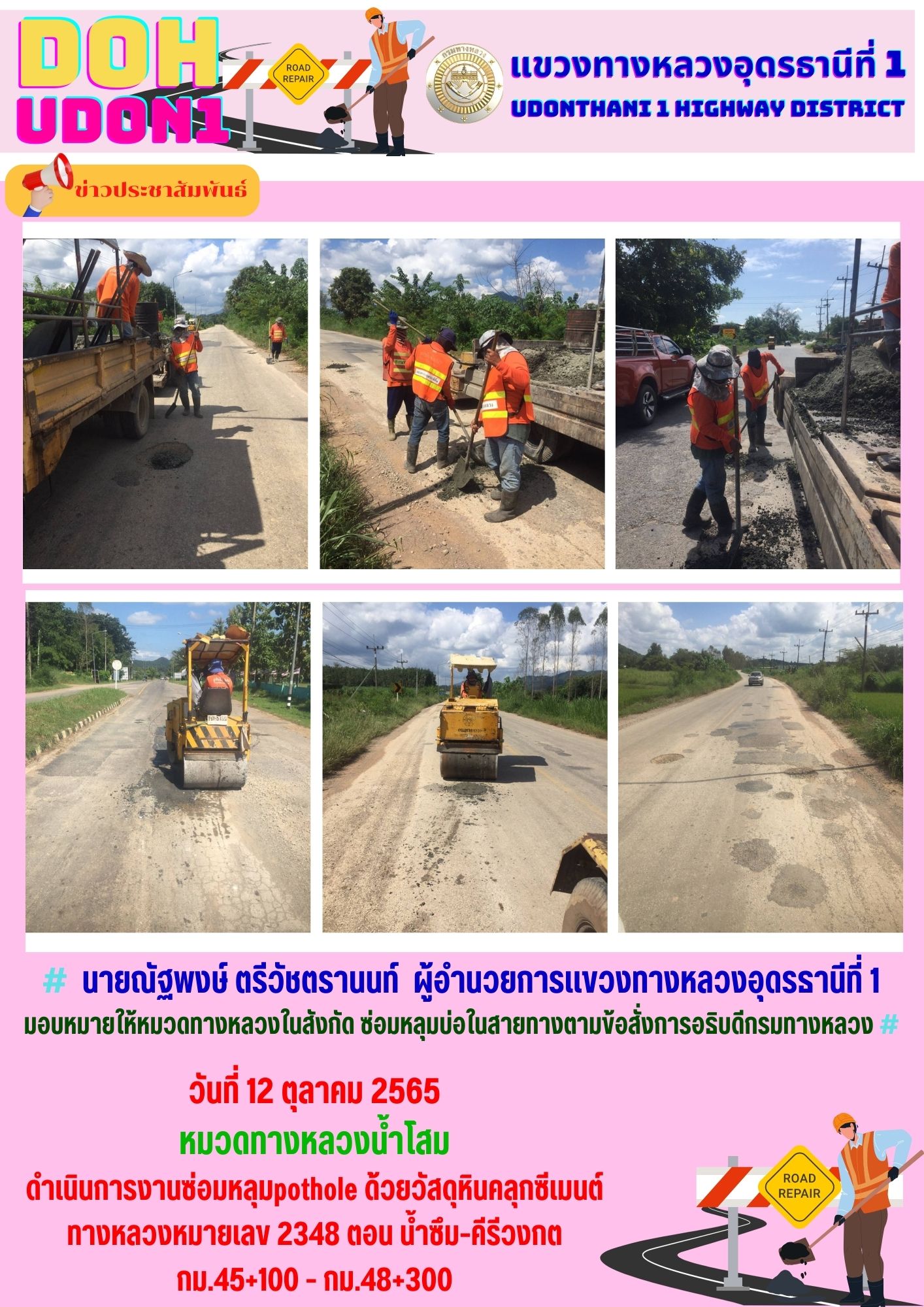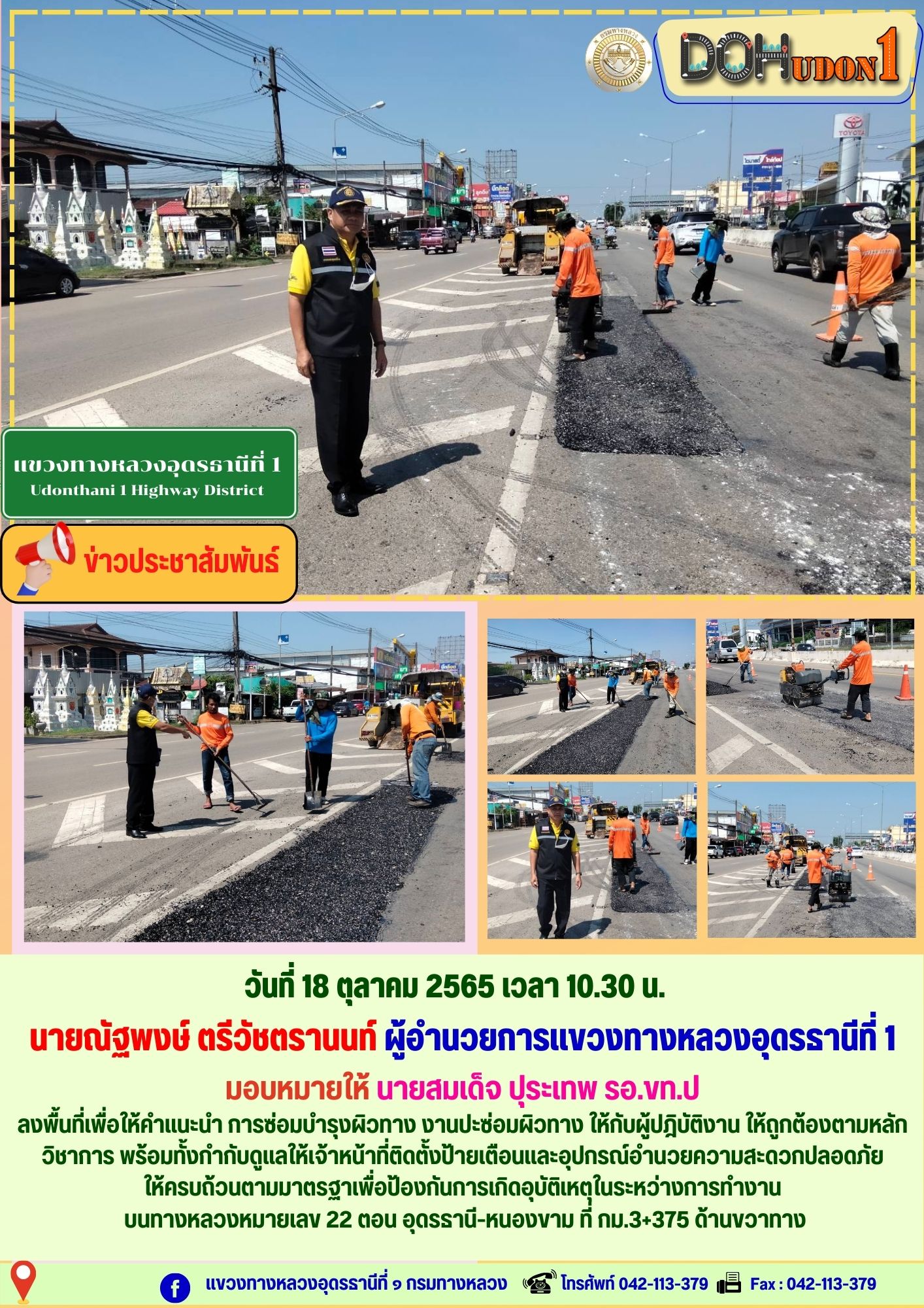 678 18/10/2565 นายณัฐพงษ์ ตรีวัชตรานนท์ ผู้อำนวยการแขวงทางหลวงอุดรธานีที่ 1 มอบหมายให้หมวดทางหลวงในสังกัด ซ่อมหลุมบ่อในสายทางตามข้อสั่งการอธิบดีกรมทางหลวง