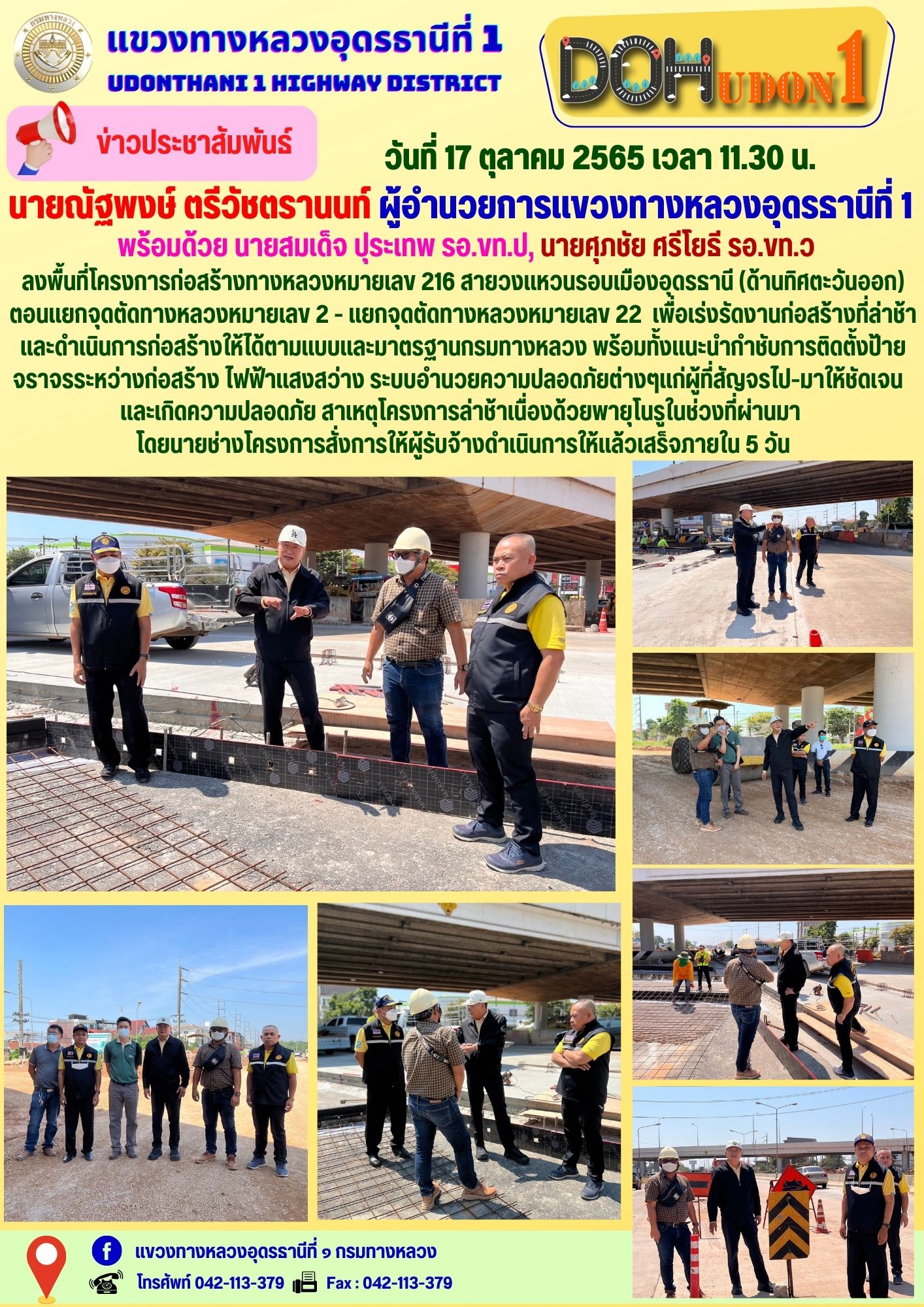 677 18/10/2565 ลงพื้นที่โครงการก่อสร้างทางหลวงหมายเลข 216 สายวงแหวนรอบเมืองอุดรธานี (ด้านทิศตะวันออก) ตอนเเยกจุดตัดทางหลวงหมายเลข 2 - แยกจุดตัดทางหลวงหมายเลข 22 เพื่อเร่งรัดงานก่อสร้างที่ล่าช้าและดำเนินการก่อสร้างให้ได้ตามแบบและมาตรฐานกรมทางหลวง