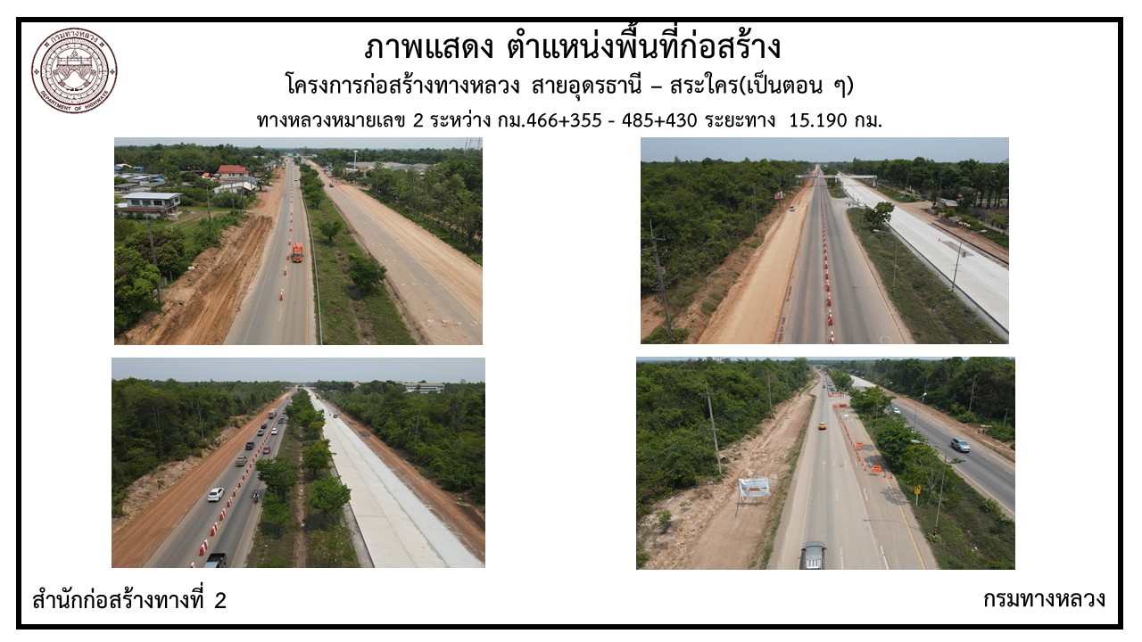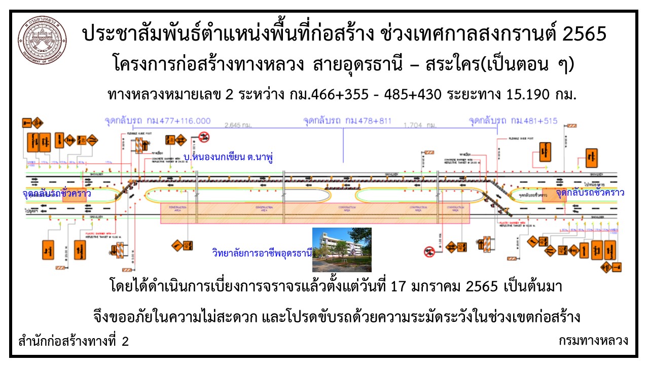 โครงการก่อสร้างทางหลวงหมายเลข 2 สายอุดรธานี – อำเภอสระใคร จะทำการเบี่ยงการจราจรและปิดจุดกลับรถ เพื่อการก่อสร้าง CONCRETE PAVEMENT บนคันทางเดิมรวมทั้งส่วนขยาย