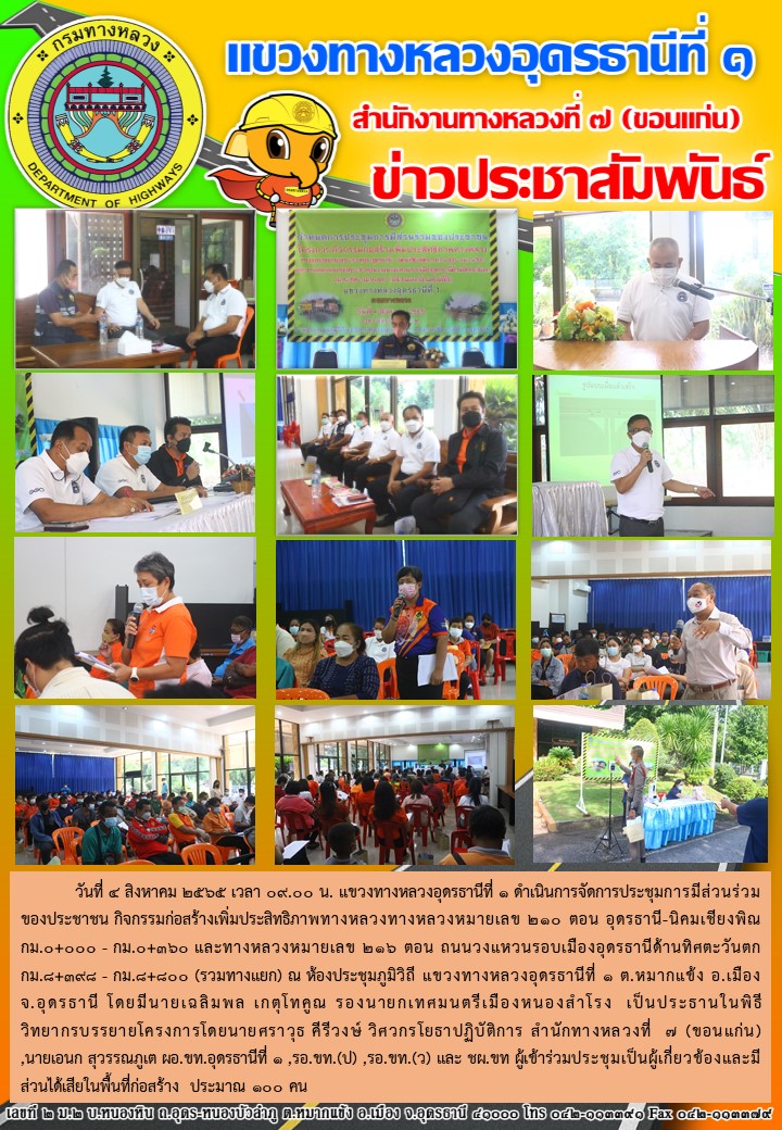 การประชุมการมีส่วนร่วมของประชาชน กิจกรรมก่อสร้างเพิ่มประสิทธิภาพทางหลวงทางหลวงหมายเลข 210 ตอน อุดรธานี-นิคมเชียงพิณ กม.0+000 - กม.0+360 และทางหลวงหมายเลข 216 ตอน ถนนวงแหวนรอบเมืองอุดรธานีด้านทิศตะวันตก กม.8+398 - กม.8+800 (รวมทางแยก)