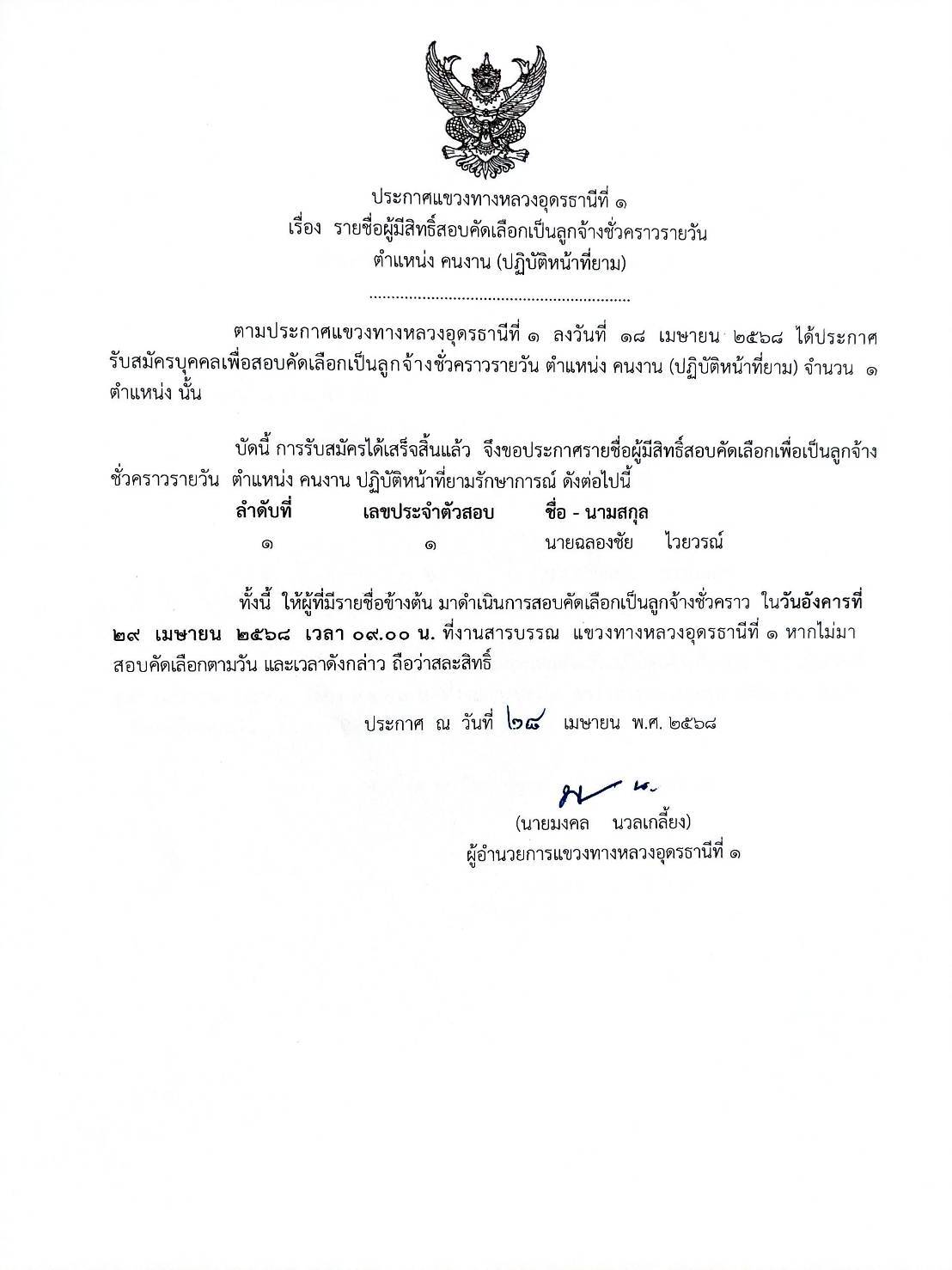 ประกาศแขวงทางหลวงอุดรธานีที่ ๑ เรื่อง รายชื่อผู้มีสิทธิ์สอบคัดเลือกเป็นลูกจ้างชั่วคราวรายวัน
