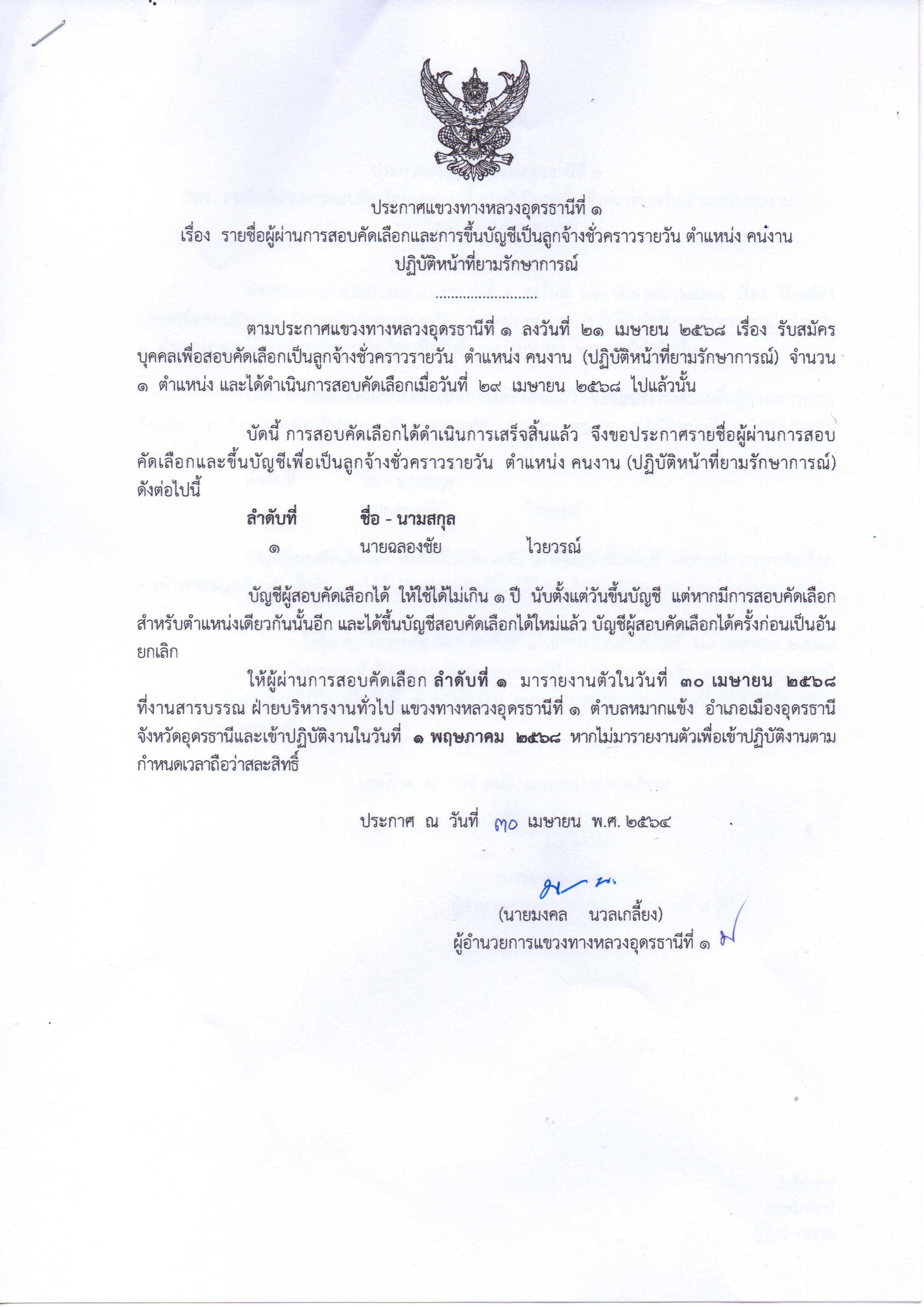 ให้ผู้ผ่านการสอบคัดเลือก ลำดับที่ 1 มารายงานตัวในวันที่ 30 เมษายน 2568