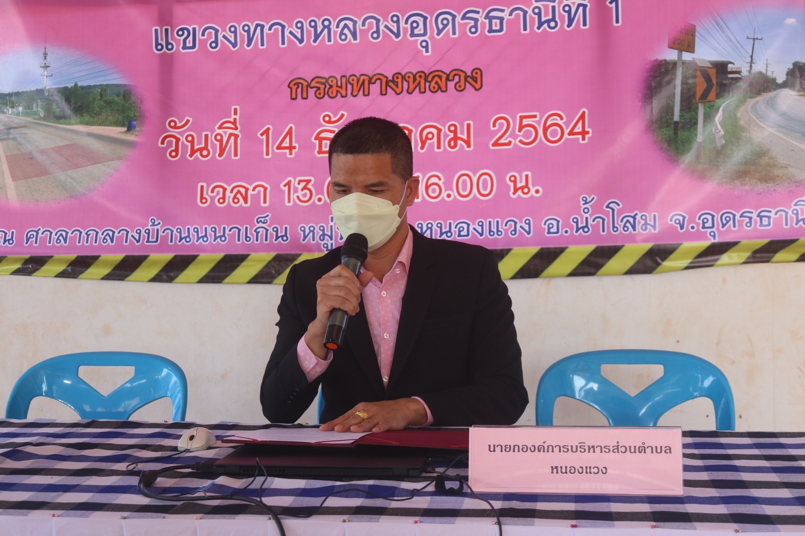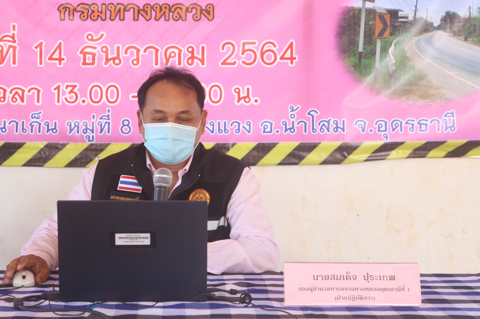 วันที่ 14 ธันวาคม 2564 เวลา 13.00 น. แขวงทางหลวงอุดรธานีที่ 1 ดำเนินการจัดการประชุมการมีส่วนร่วมของประชาชน โครงการก่อสร้าง ปรับปรุง สะพานและอาคารระบายน้ำ ทางหลวงหมายเลข 2376 ตอน น้ำซึม-โสกกล้า กม.7+667 -กม.7+976 ด้านขวาทาง ณ ศาลากลางบ้านนาเก็น ต.หนองแวง อ.น้ำโสม จ.อุดรธานี โดยมี พ.อ.อ.อุเทน จามน้อยพรหม ปลัดองค์การบริหารส่วนตำบลหนองแวง เป็นประธานในพิธี วิทยากรบรรยายโครงการโดย นายสมเด็จ ปุระเทพ รอ.ขท.(ป) และนายวัชรพงษ์ ปลัดศรีช่วย หัวหน้าหมวดทางหลวงน้ำโสม ผู้เข้าร่วมประชุมเป็นผู้เกี่ยวข้องและมีส่วนได้เสียในพื้นที่ก่อสร้าง ประมาณ 100 คน