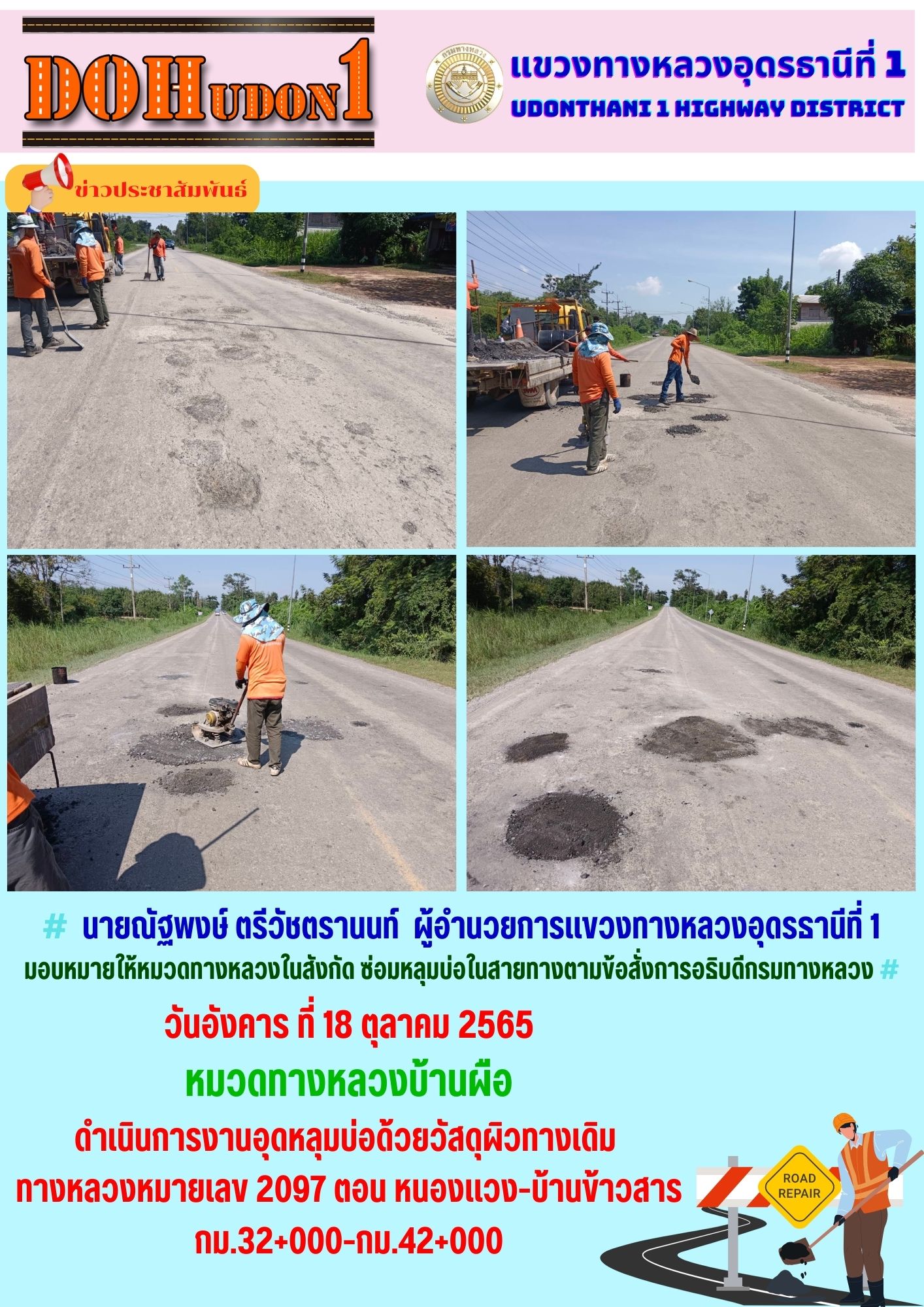 นายณัฐพงษ์ ตรีวัชตรานนท์ ผู้อำนวยการแขวงทางหลวงอุดรธานีที่ 1 มอบหมายให้หมวดทางหลวงในสังกัด ซ่อมหลุมบ่อในสายทางตามข้อสั่งการอธิบดีกรมทางหลวง