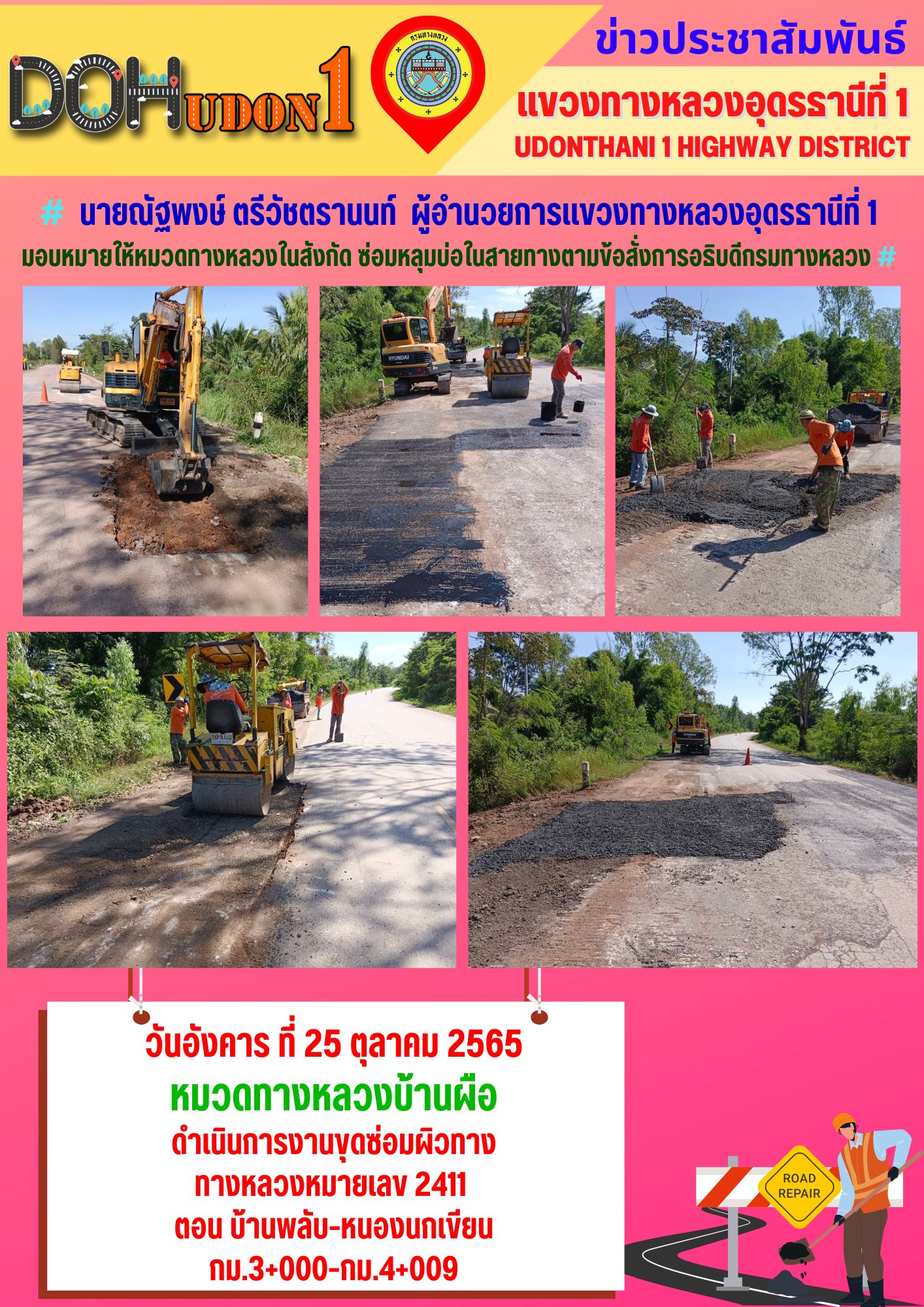 นายณัฐพงษ์ ตรีวัชตรานนท์ ผู้อำนวยการแขวงทางหลวงอุดรธานีที่ 1 มอบหมายให้หมวดทางหลวงในสังกัด ซ่อมหลุมบ่อในสายทางตามข้อสั่งการอธิบดีกรมทางหลวง