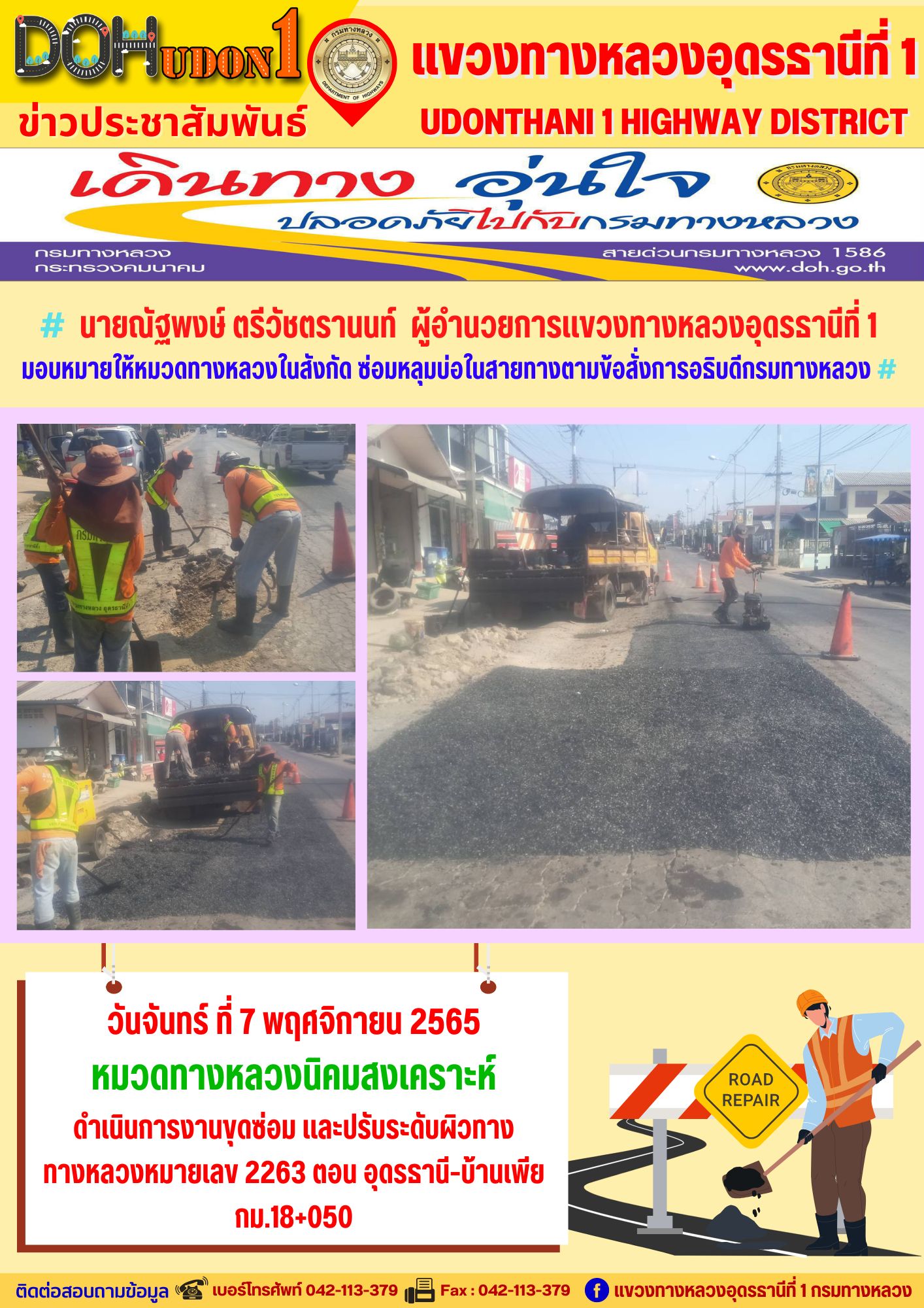 นายณัฐพงษ์ ตรีวัชตรานนท์ ผู้อำนวยการแขวงทางหลวงอุดรธานีที่ 1 มอบหมายให้หมวดทางหลวงในสังกัด ซ่อมหลุมบ่อในสายทางตามข้อสั่งการอธิบดีกรมทางหลวง