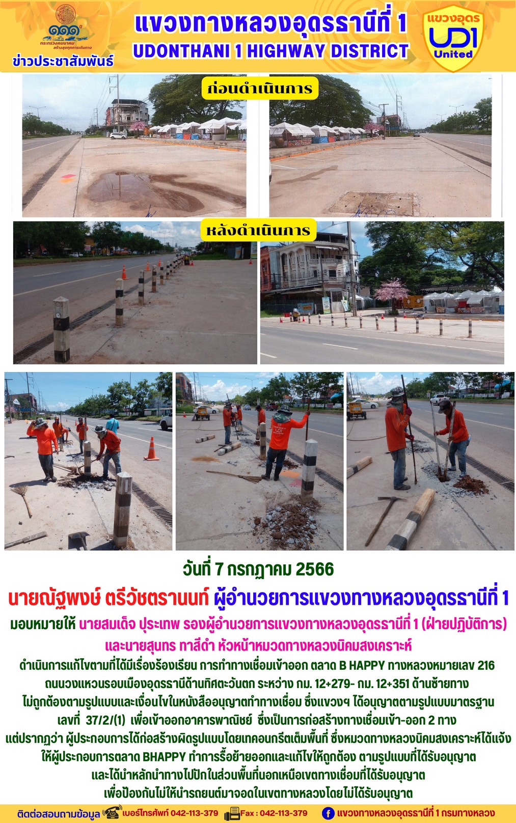 ดำเนินการแก้ไขตามที่ได้มีเรื่องร้องเรียน การทำทางเชื่อมเข้าออก ตลาด B HAPPY ทางหลวงหมายเลข 216