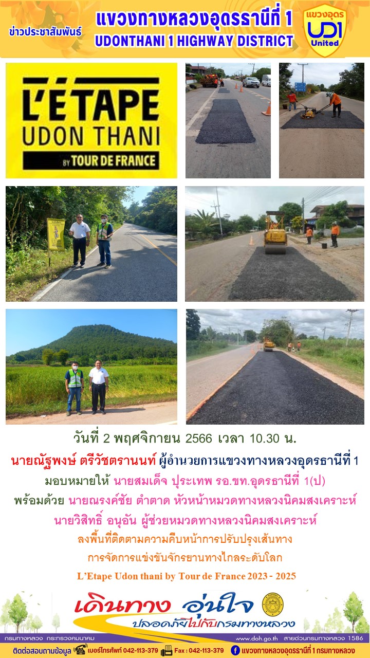นายณัฐพงษ์ ตรีวัชตรานนท์ ผู้อำนวยการแขวงทางหลวงอุดรธานีที่ 1 มอบหมายให้ นายสมเด็จ ปุระเทพ รองผู้อำนวยการฝ่ายปฏิบัติการ พร้อมด้วย นายณรงค์ชัย ตำตาด หัวหน้าหมวดทางหลวงนิคมสงเคราะห์ และนายวิสิทธิ์ อนุอัน ผู้ช่วยหมวดทางหลวงนิคมสงเคราะห์ ลงพื้นที่ติดตามความคืบหน้าการปรับปรุงเส้นทางการจัดการแข่งขันจักรยานทางไกล L'ETAPE UDONTHANI BY TOUR DE FRANCE 2023 ทางหลวงหมายเลข 2 ตอน โนนสะอาด - อุดรธานี และ ทางหลวงหมายเลข 2316 ตอน ท่ายม - บ้านเหล่า