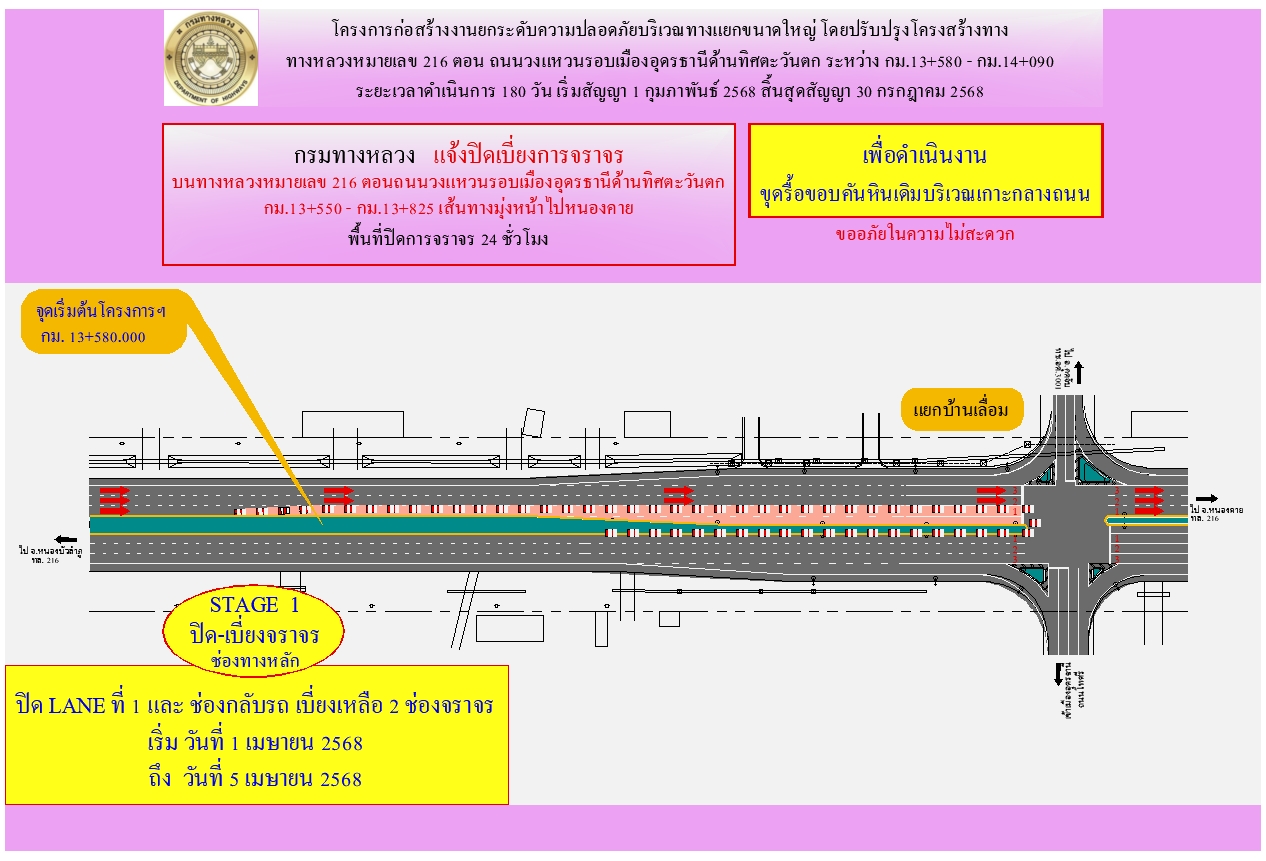 การเบี่ยงการจราจร งานยกระดับความปลอดภัยบริเวณทางแยกขนาดใหญ่ ทางหลวงหมายเลข 216 ตอน ถนนวงแหวนรอบเมืองอุดรธานีด้านทิศตะวันตก ระหว่าง กม.13+580 - กม.14+090