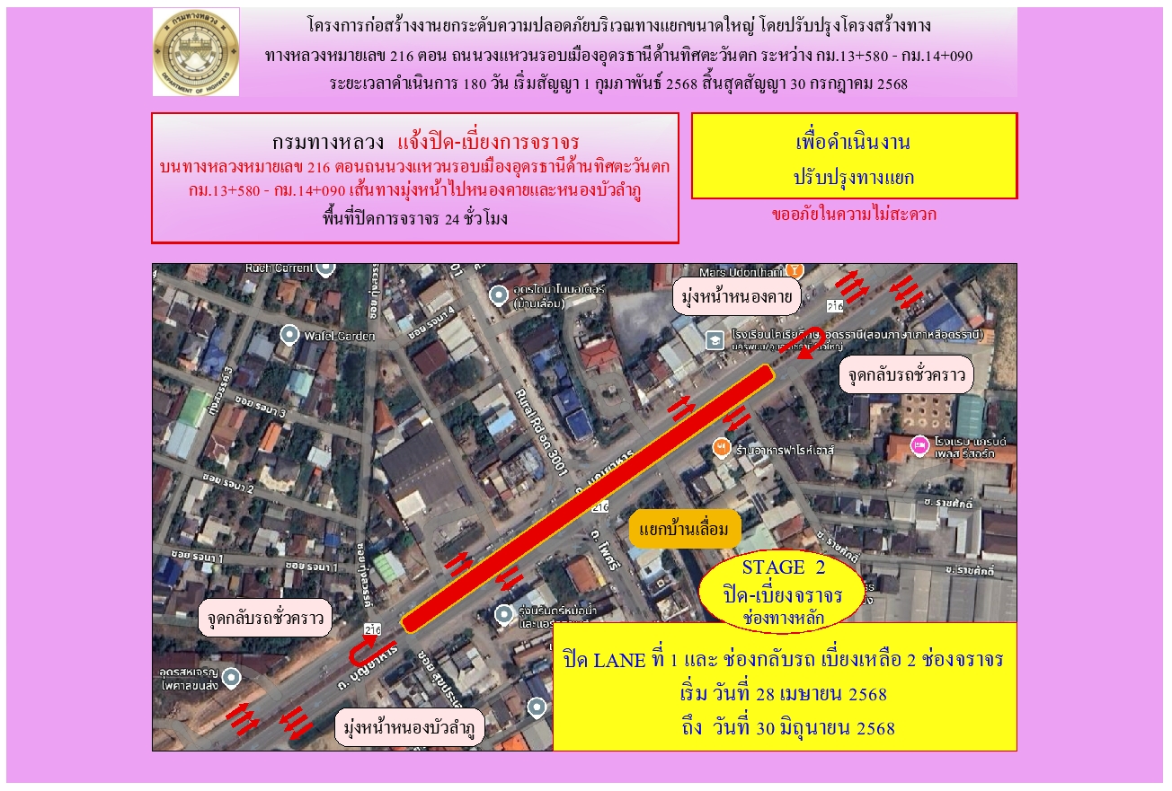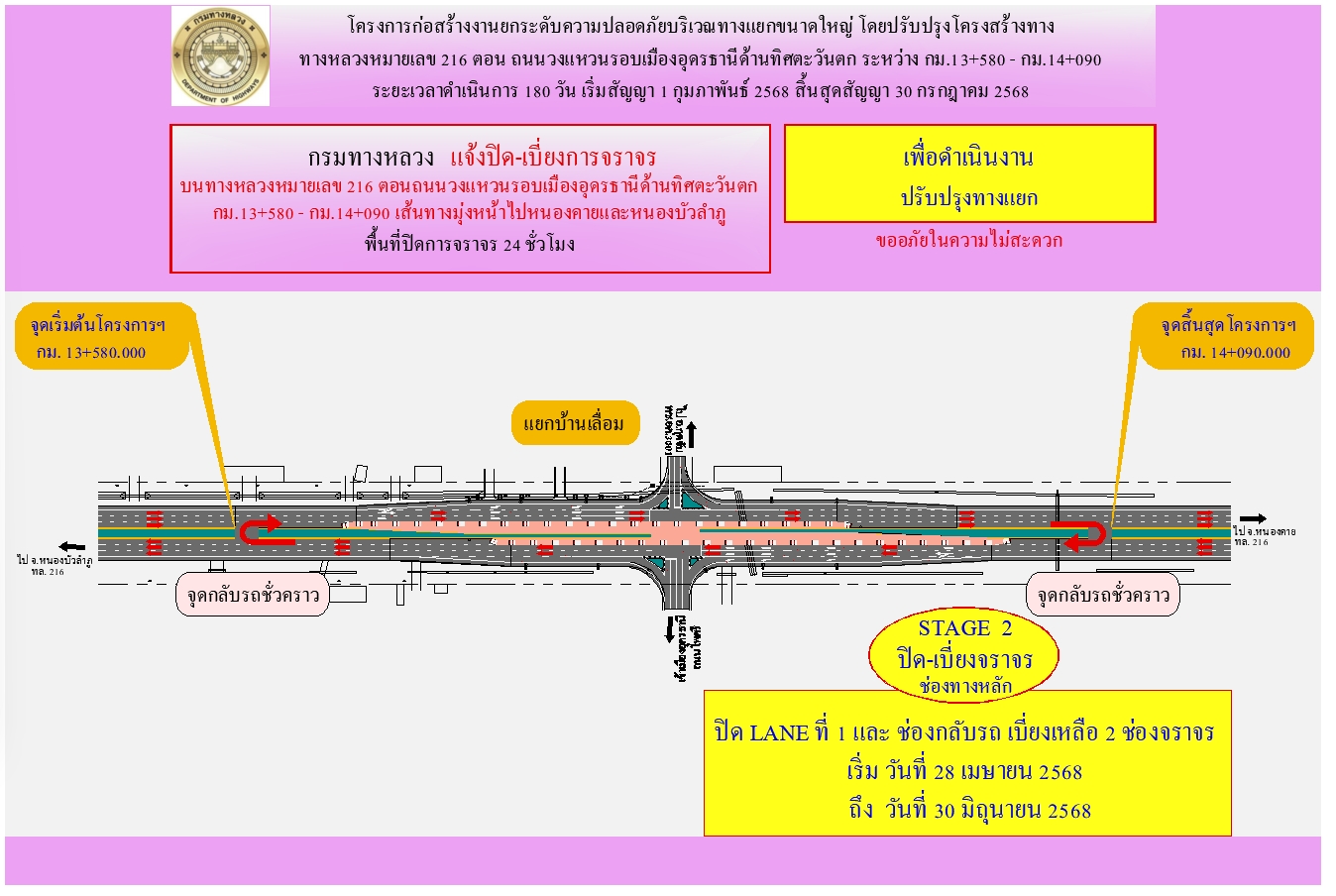 ปิดเบี่ยงการจราจร งานยกระดับความปลอดภัยบริเวณทางแยกขนาดใหญ่ ทางหลวงหมายเลข 216 ตอน ถนนวงแหวนรอบเมืองอุดรธานีด้านทิศตะวันตก ระหว่าง กม.13+580 - กม.14+090 (สี่แยกไฟจราจรบ้านเลื่อม)